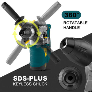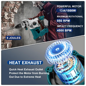 - Powerful Motor: Equipped with a 12.5A (1500W) high-performance motor delivering 6 Joules of impact energy for efficient drilling and chiseling in concrete, brick, metal, and wood.